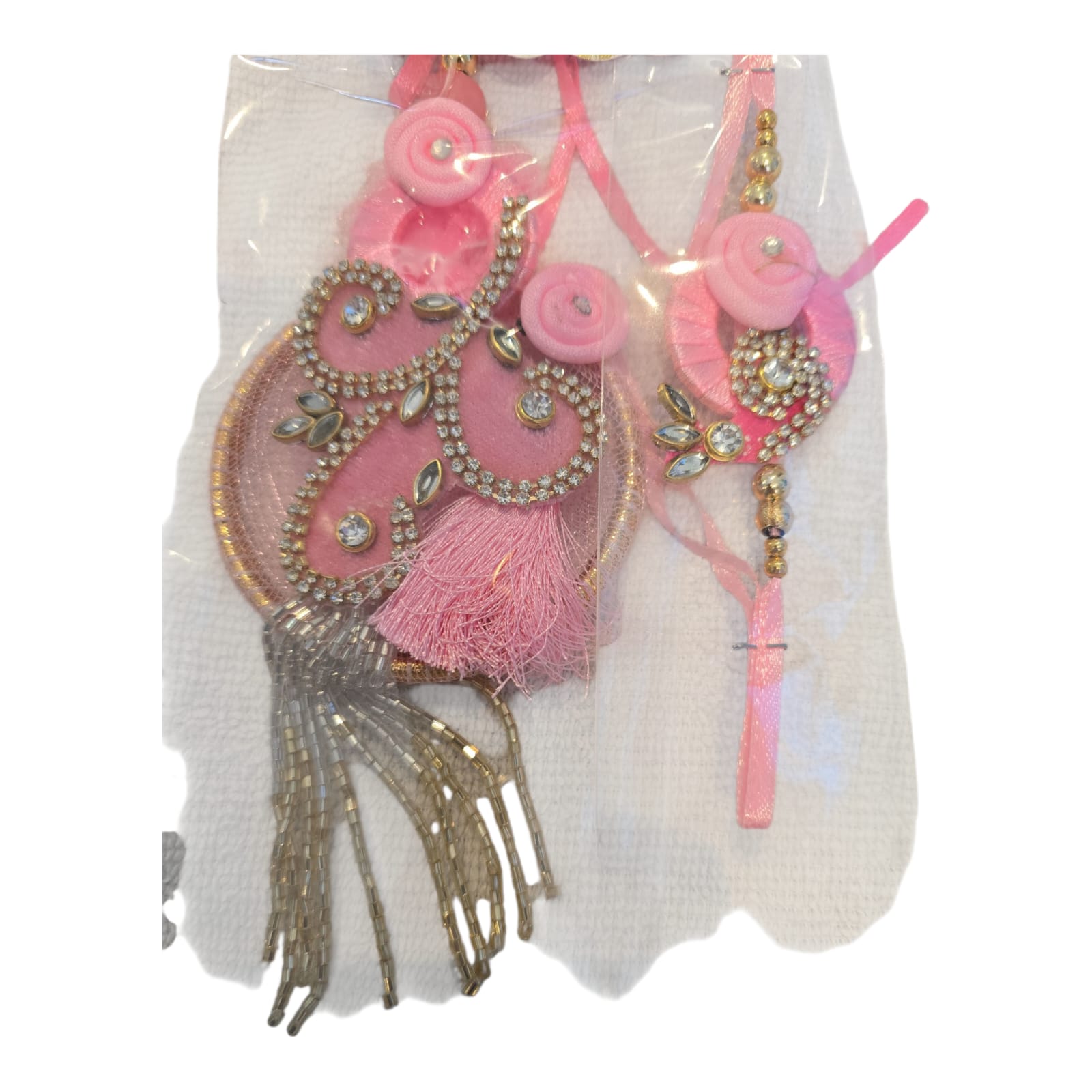 Celebrate Raksha Bandhan with this beautifully handcrafted Bhaiya Bhabhi Rakhi set in soft pink tones. Adorned with sparkling stones, delicate beadwork, and stylish tassels, it adds a touch of royalty to your festive gift. Ideal for sisters looking to send love in a stylish way.