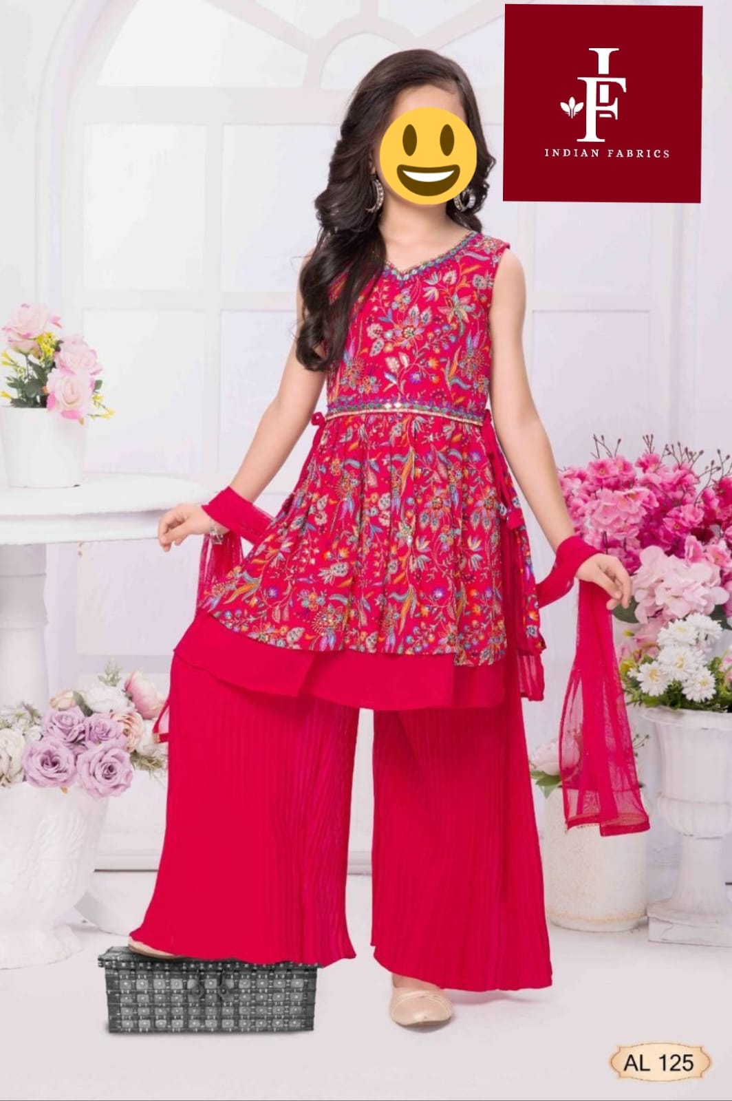 Dress your little princess in timeless elegance with this vibrant ethnic ensemble from Indian Fabrics. This stunning set features a sleeveless peplum-style kurti adorned with intricate floral embroidery in multicolored threads, creating a rich and festive look. Paired with flowy, pleated palazzo pants and a matching dupatta, this outfit is perfect for weddings, festivals, and special occasions.