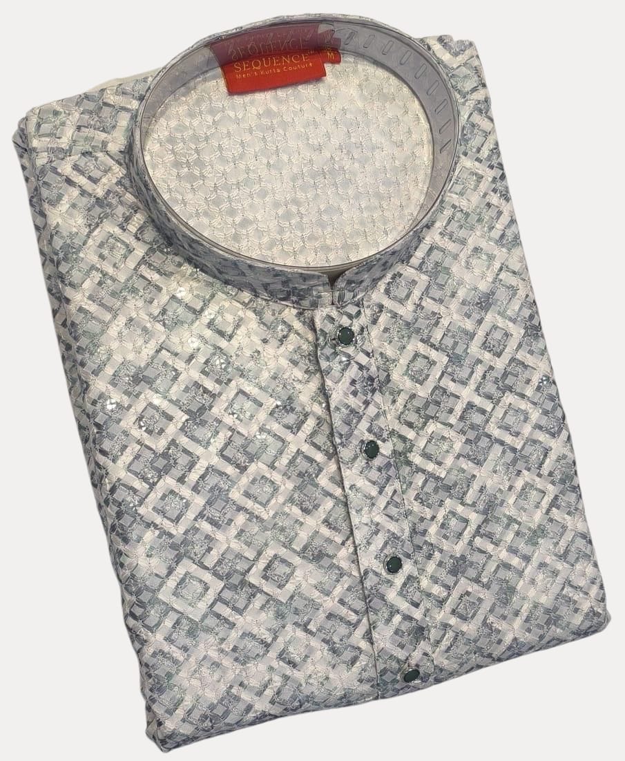 Elevate your ethnic style with this striking grey and white geometric jacquard kurta from Indian Fabrics.