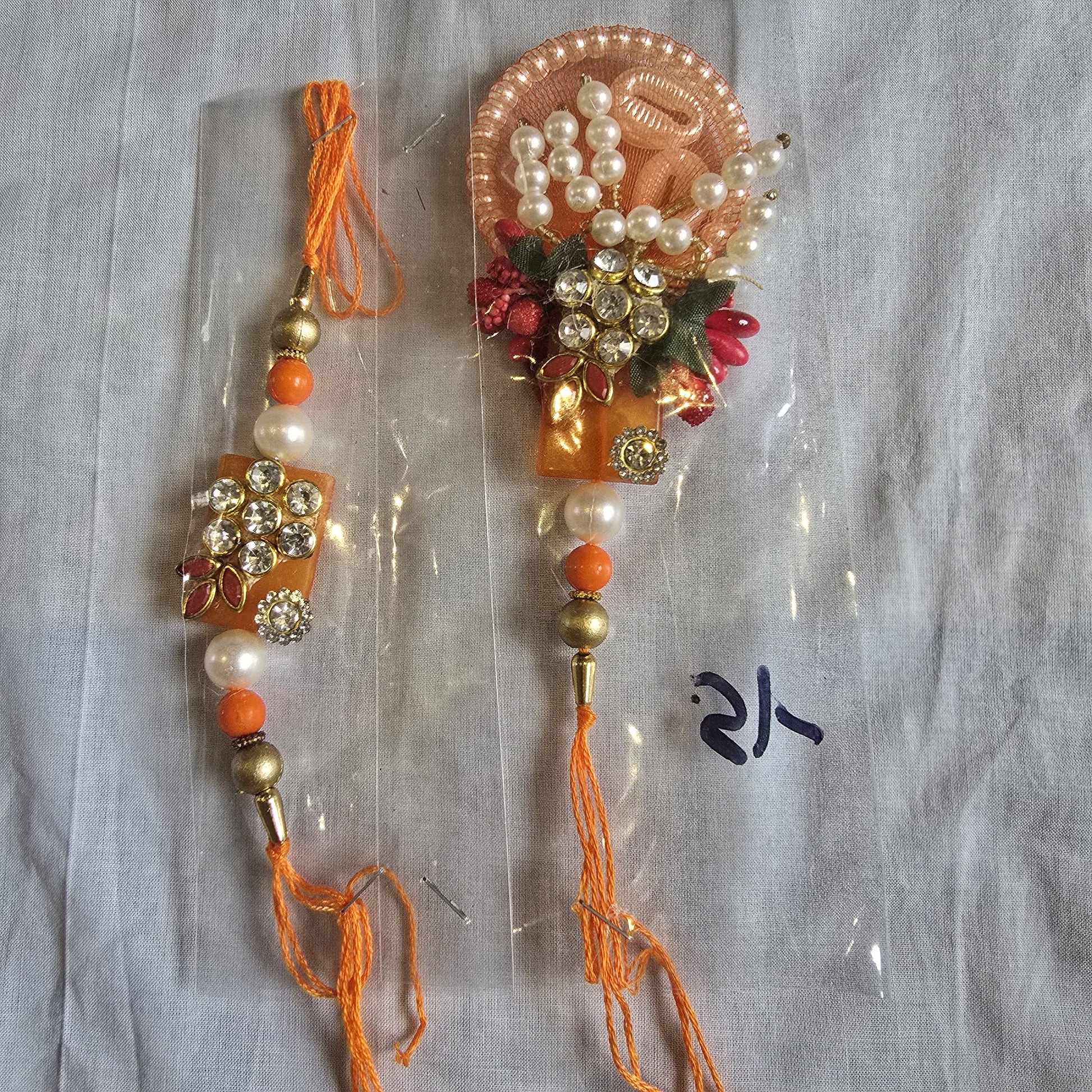 Celebrate Raksha Bandhan with this stunning handcrafted Bhaiya Bhabhi Rakhi set, featuring intricate mirror work, orange floral beads, and orange thread accents. A festive and vibrant piece to make your sibling bond extra special.
