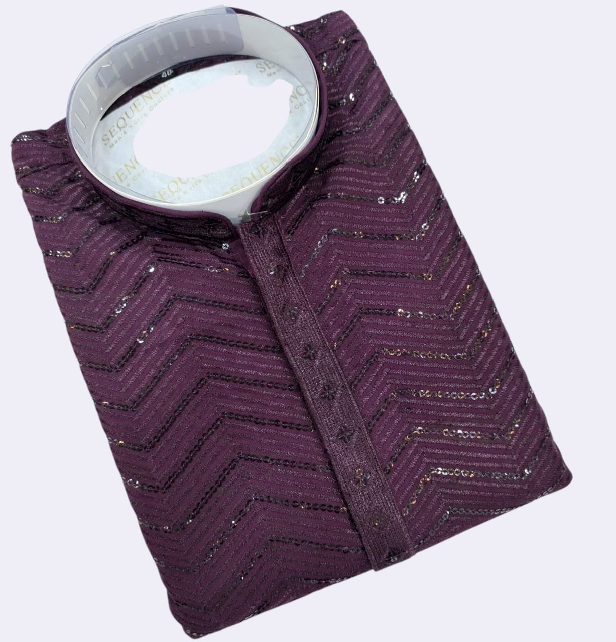 Make a bold and stylish statement with this deep purple sequin kurta from the exclusive Men's Collection. Designed with a modern zigzag embroidery pattern and highlighted with shimmering sequins, this kurta delivers sophistication with a touch of glam—ideal for evening events, festive celebrations, or sangeet nights.