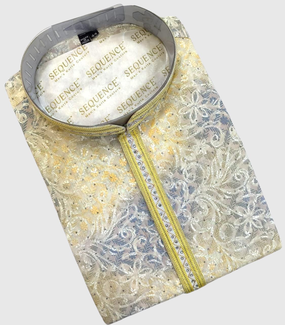 Elevate your ethnic wardrobe with this regal golden yellow embroidered kurta – a luxurious creation crafted for grandeur. The rich brocade-inspired fabric features elegant floral embroidery in warm yellow and silver tones, complemented by a delicately beaded central placket finished with gold detailing.