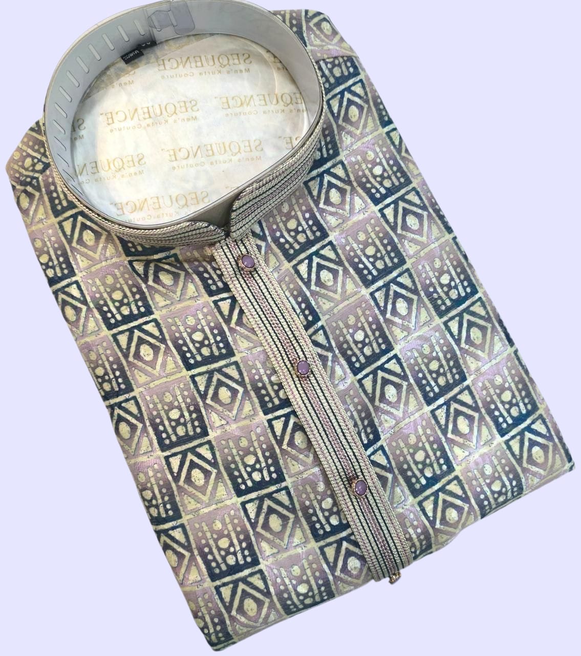 Elevate your ethnic fashion game with this pastel geometric designer kurta. Featuring a stunning fusion of traditional craftsmanship and contemporary design, this kurta showcases a striking blend of lavender, cream, and navy tones with intricate geometric motifs and mirror-effect highlights.