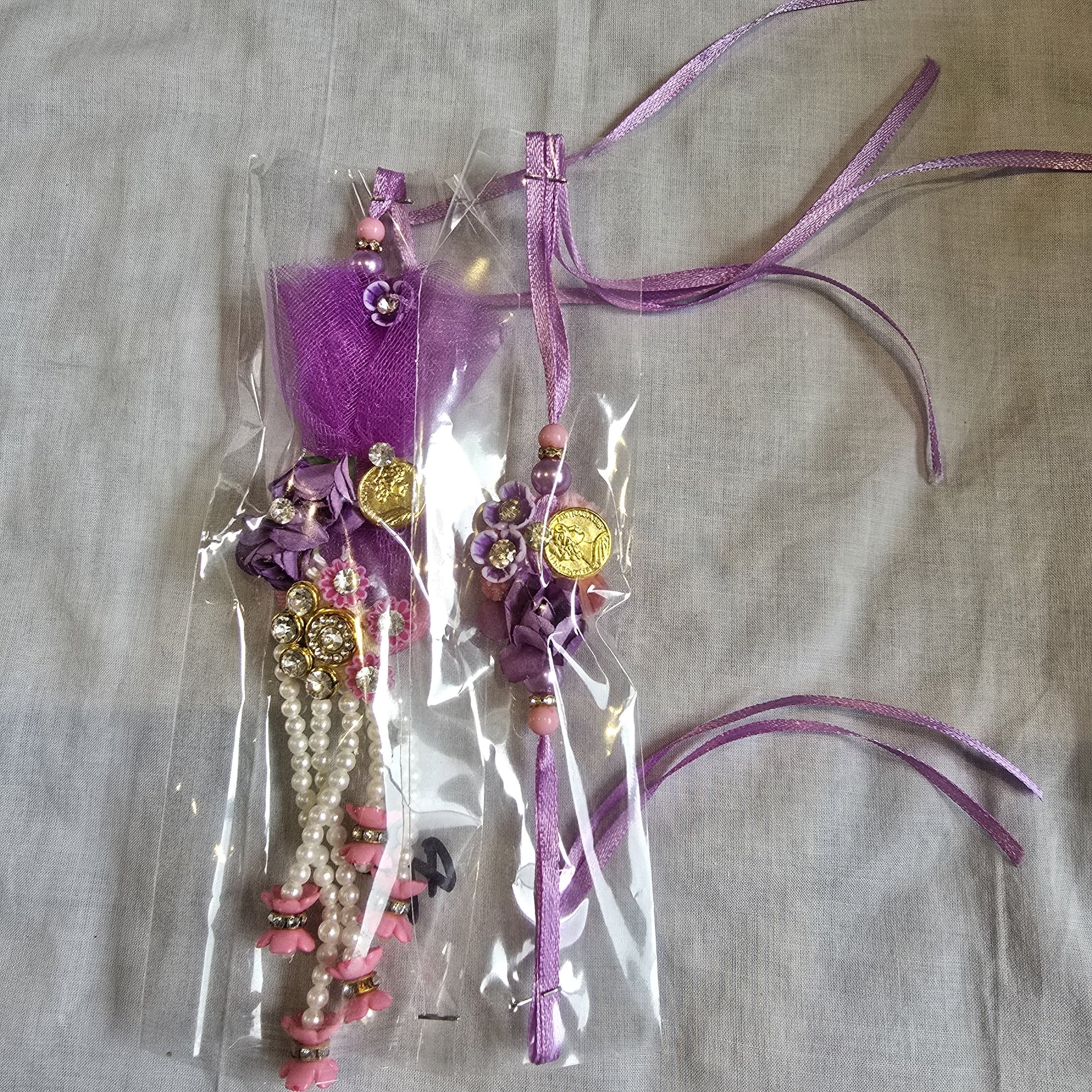 Celebrate the bond with your sister-in-law with this graceful purple Lumba Rakhi set, featuring floral designs, golden coin charms, pearl strands, and soft satin threads. A perfect Rakhi gift for bhabhi this Raksha Bandhan..